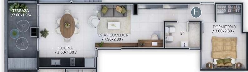 • ambientes Balcón, Living comedor, Cocina Americana